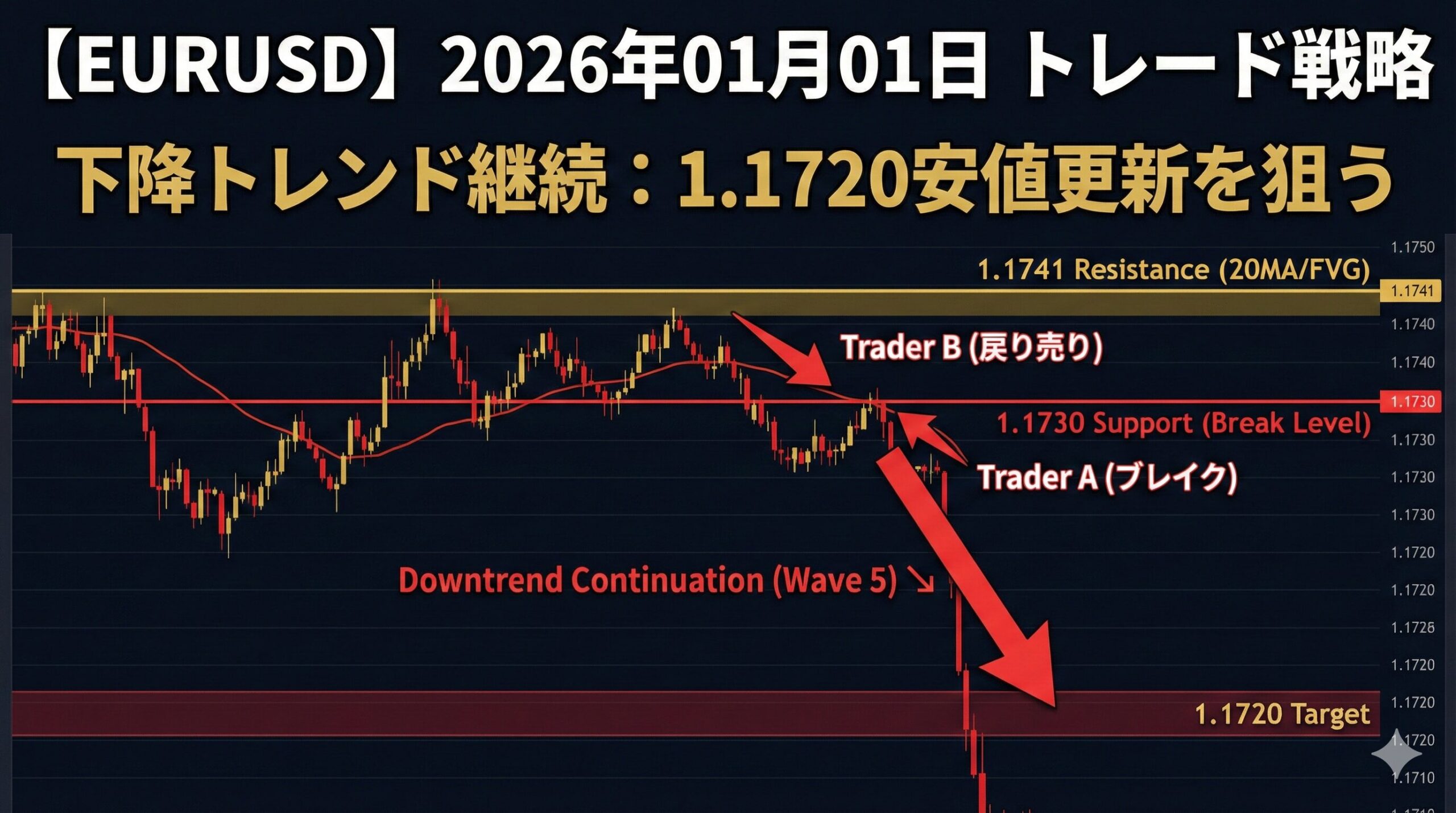 2026年01月01日のEURUSD分析。下降トレンド継続中、20MA戻り売りに注目。Trader A/B戦略でRR比2.2を実現。テクニカル分析に基づく実践的戦略。
