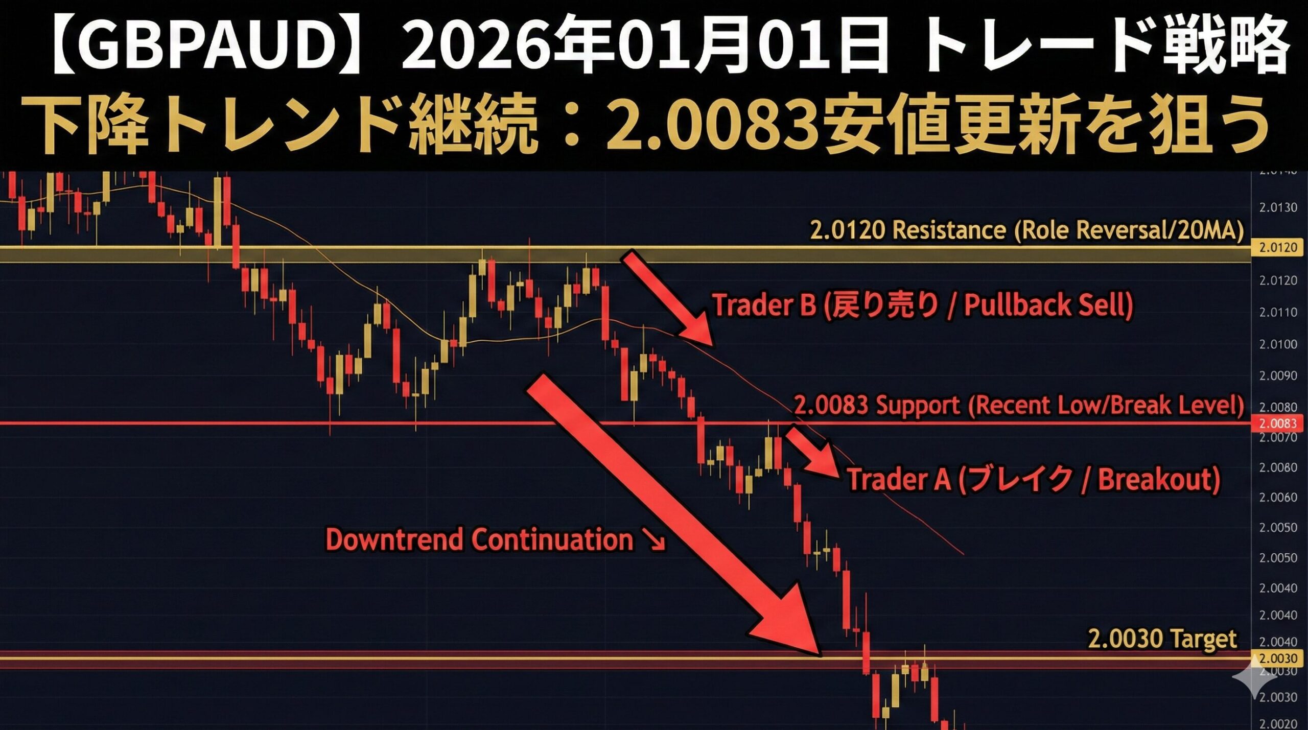 【GBPAUD】2026年01月01日のトレード戦略 | 下降トレンド継続で2.0083安値更新を狙う