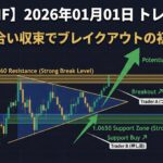このサポートを下抜けると、Trader A(初動型)のブレイクアウト戦略が発動します。エリオット波動の第3波または第5波の進行を示唆します。