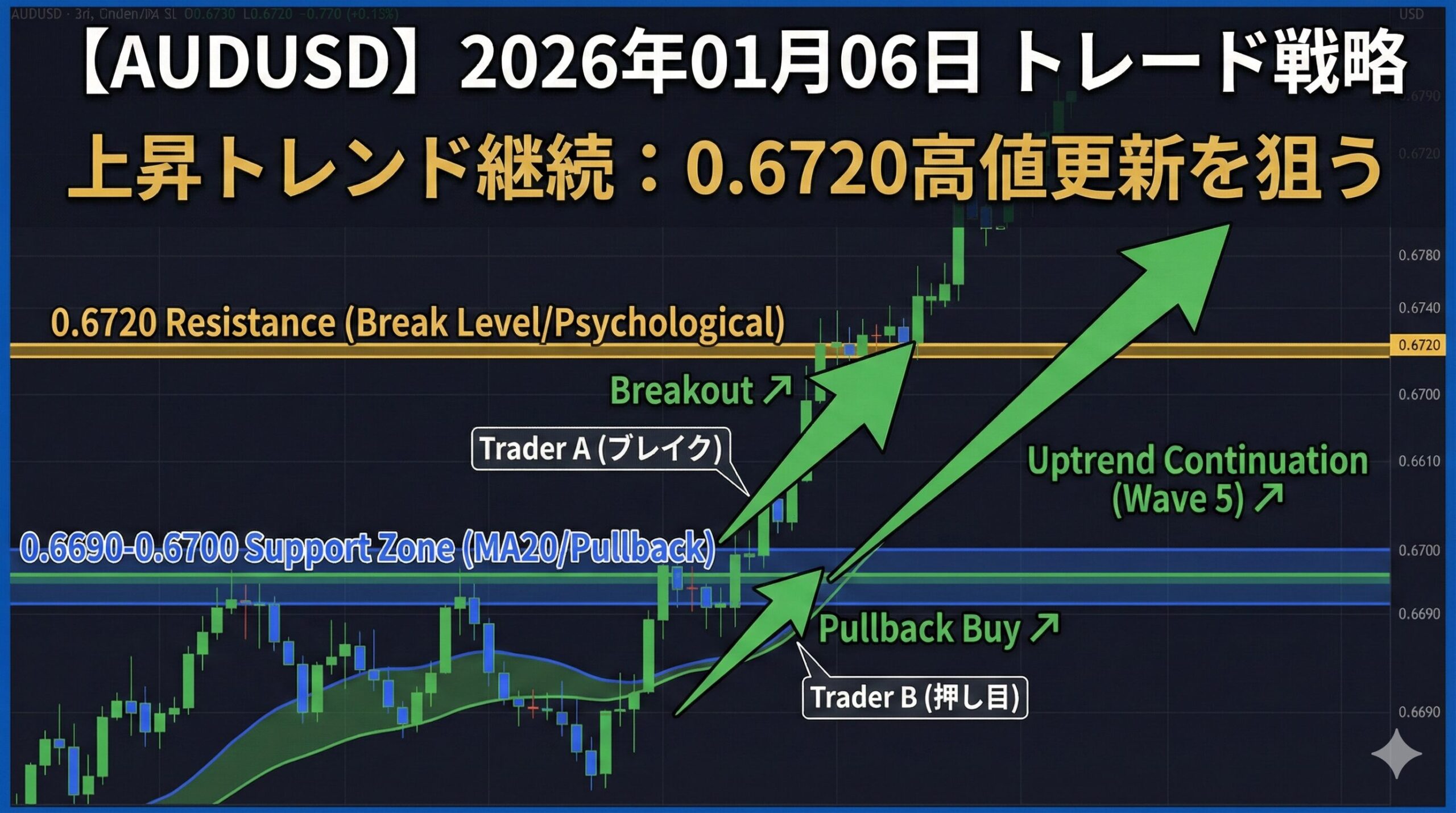 - Trader A(初動型): レジスタンス0.6720ブレイクを狙うアグレッシブなトレンドフォロー戦略