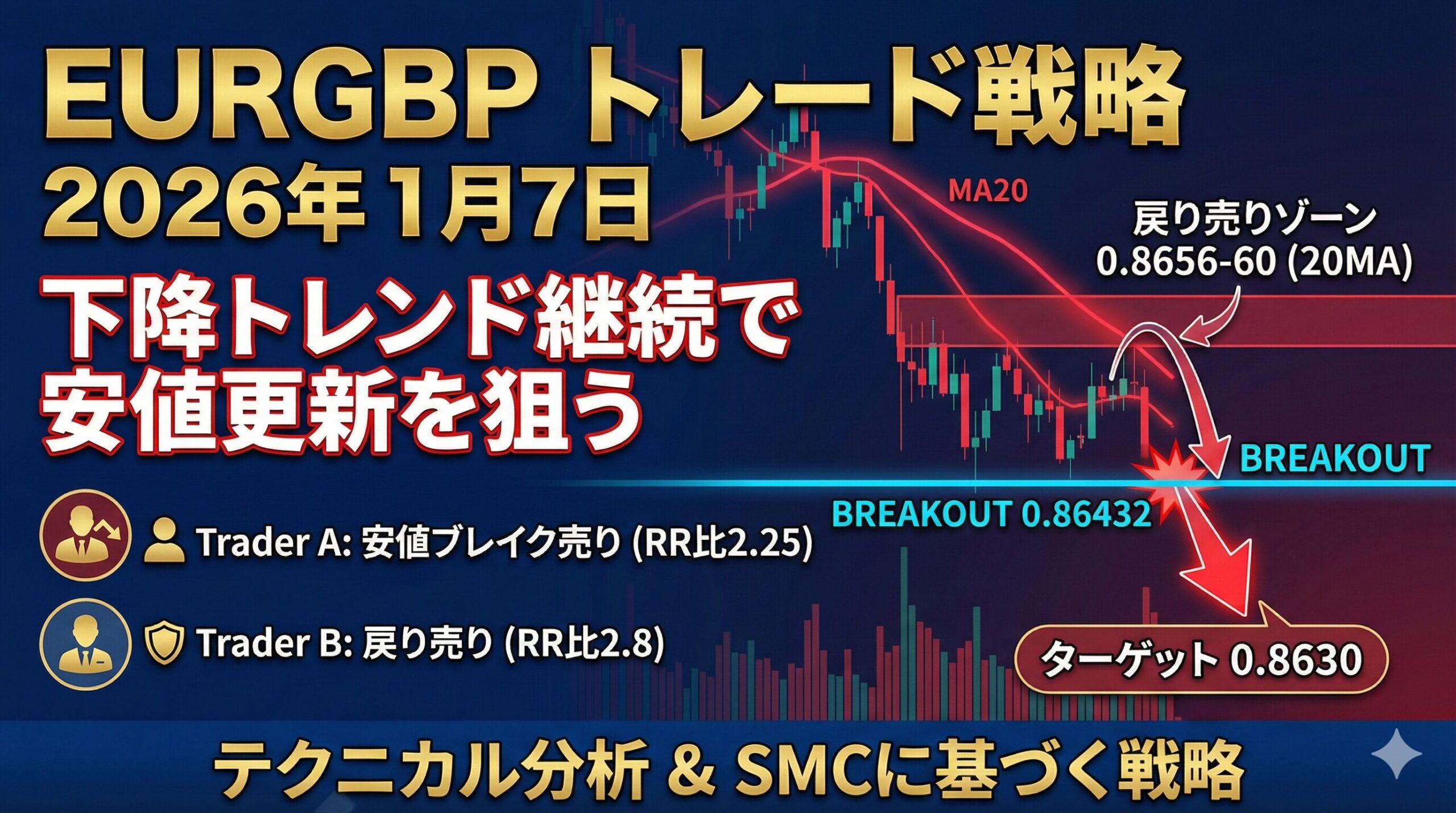 2026年1月7日のEURGBP分析。下降トレンド継続中、20MA戻り売りと安値ブレイクに注目。Trader A/B戦略でRR比最大2.8を実現。テクニカル分析に基づく実践的戦略を解説します。