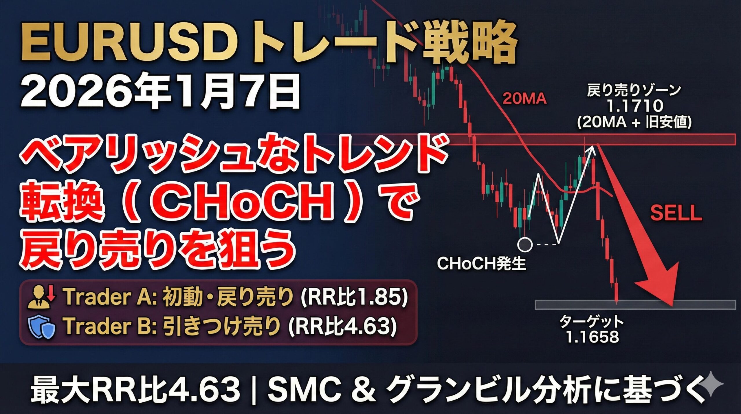 2026年01月07日のEURUSD分析。上昇トレンドの安値を割り込み、弱気トレンドへ転換中。1.1710付近のレジスタンスおよび20MAでの戻り売りに注目。Trader A/B戦略で最大RR比4.63を実現。テクニカル分析に基づく実践的戦略。