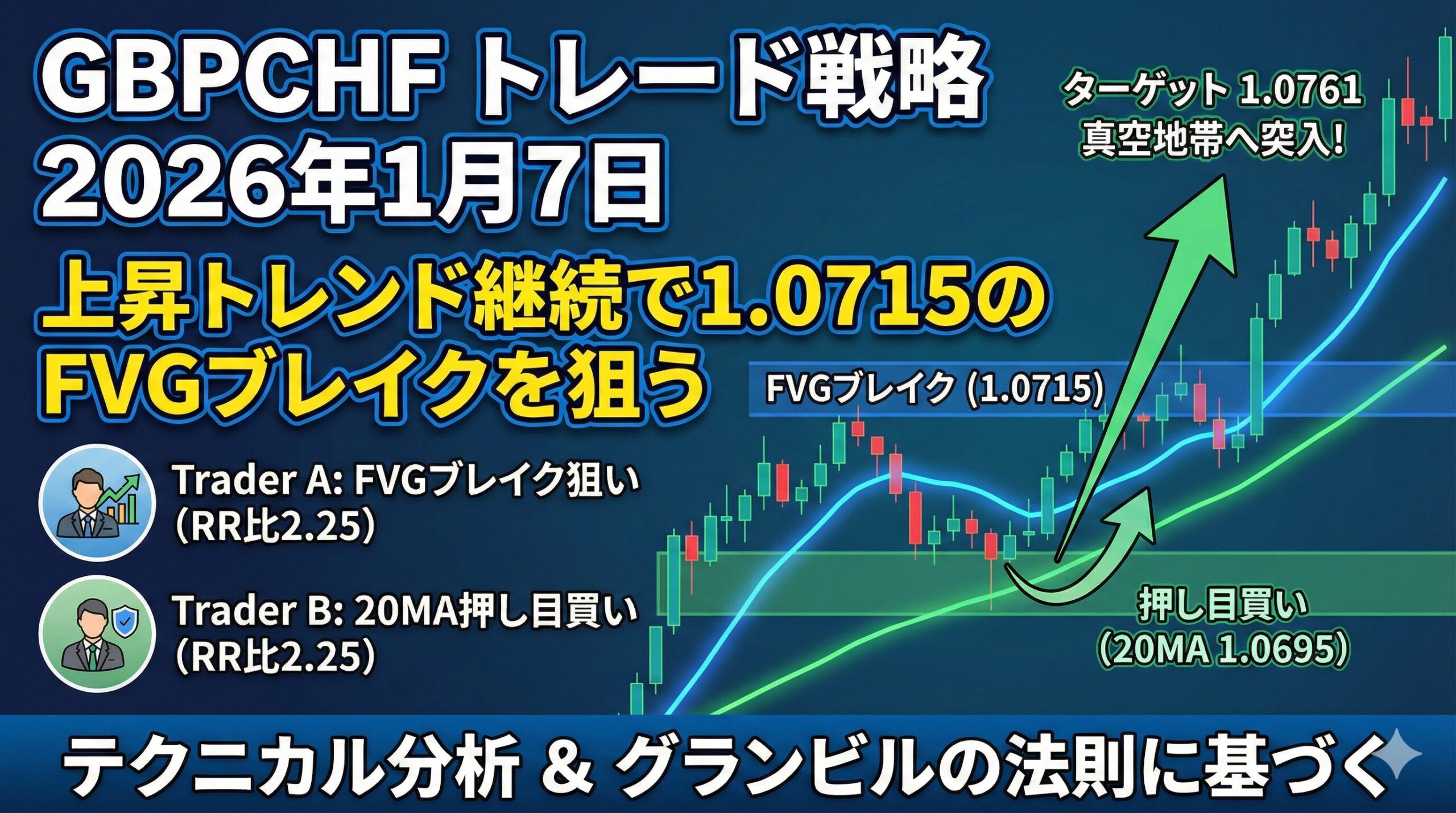 2026年1月7日のGBPCHF分析。上昇トレンド継続中、1.0695付近の20MA押し目買いに注目。Trader A/B戦略でRR比2.25を実現。テクニカル分析に基づく実践的戦略。