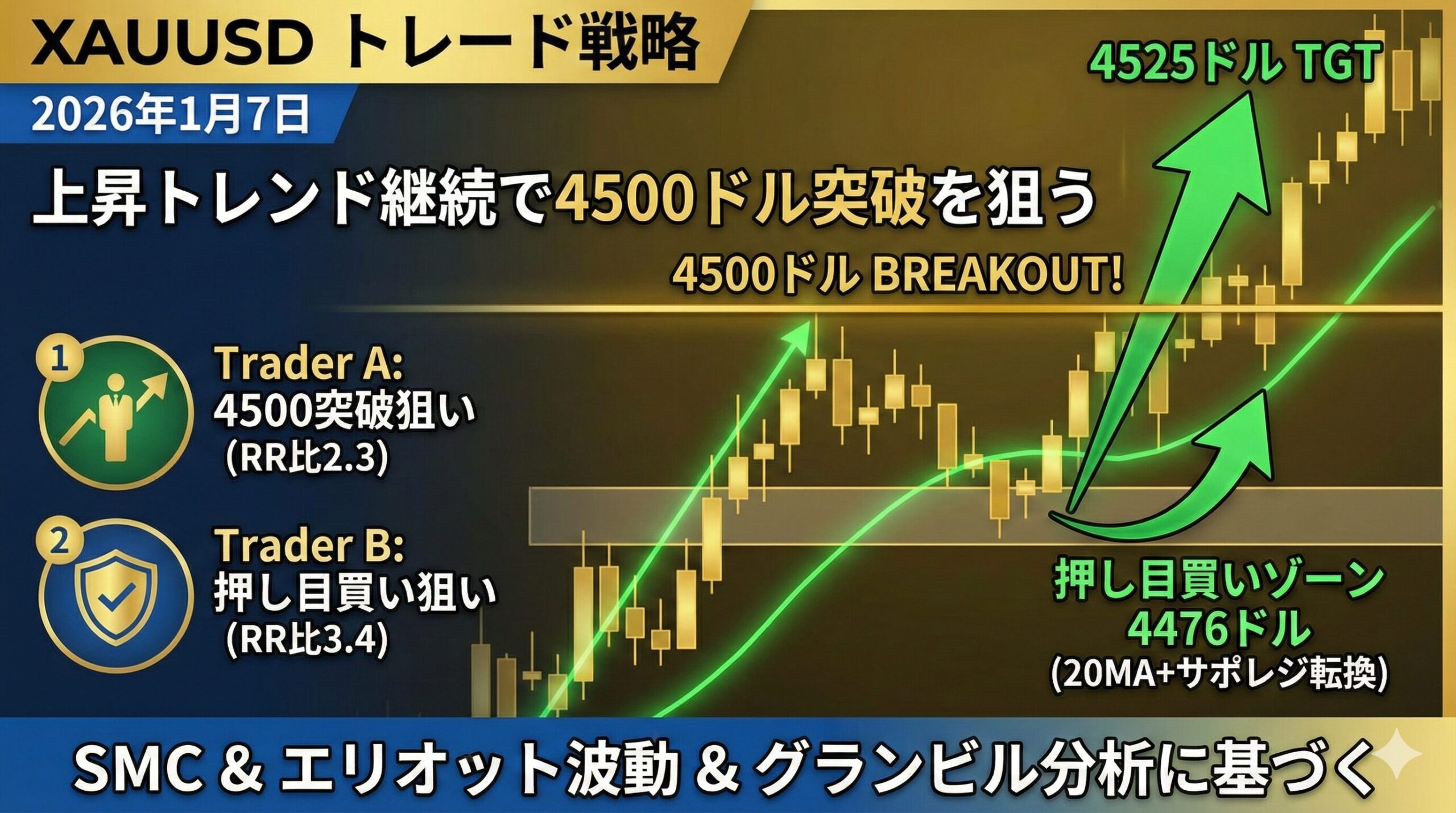 2026年1月7日のXAUUSD(ゴールド)分析。強力な上昇トレンド継続中、心理的節目4500ドルのブレイクと、4476ドル付近の押し目買いに注目。Trader A/B戦略で最大RR比3.4を実現。テクニカル分析とSMCに基づく実践的戦略解説。