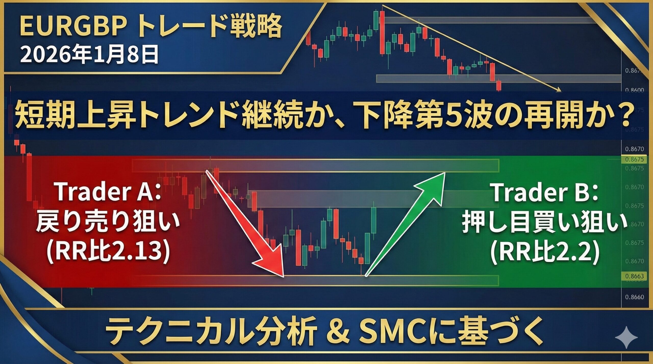 2026年1月8日のEURGBP分析。4時間足は下降、1時間足は上昇とトレンドが対立する調整局面。0.8675付近の攻防に注目し、Trader A(戻り売り)とTrader B(押し目買い)の2つの戦略でRR比2.0以上を狙います。