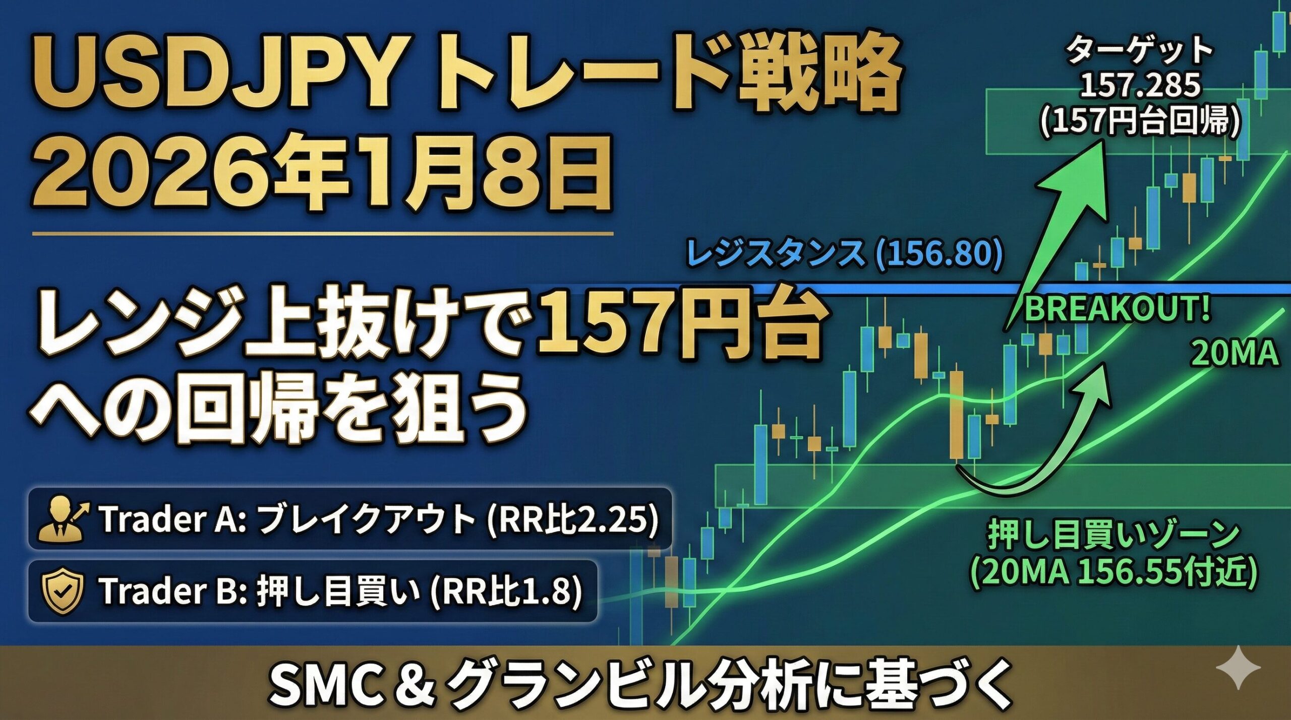 2026年1月8日のUSDJPY分析。156.80円の強固なレジスタンス突破に注目。Trader A(ブレイク)とTrader B(押し目)の2つの戦略で、最大RR比2.25を狙います。レンジ相場ですがMAはパーフェクトオーダーで地合いは強気です。