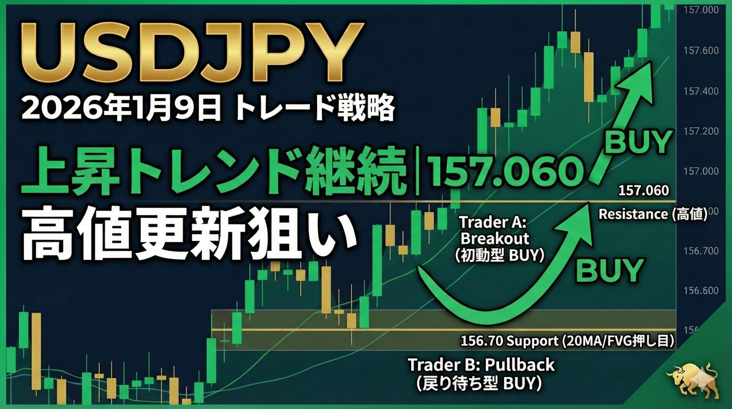 2026年01月09日(金)のUSDJPY(米ドル/日本円)について、裁量トレード×クオンツ分析の視点から戦略を立案しました。