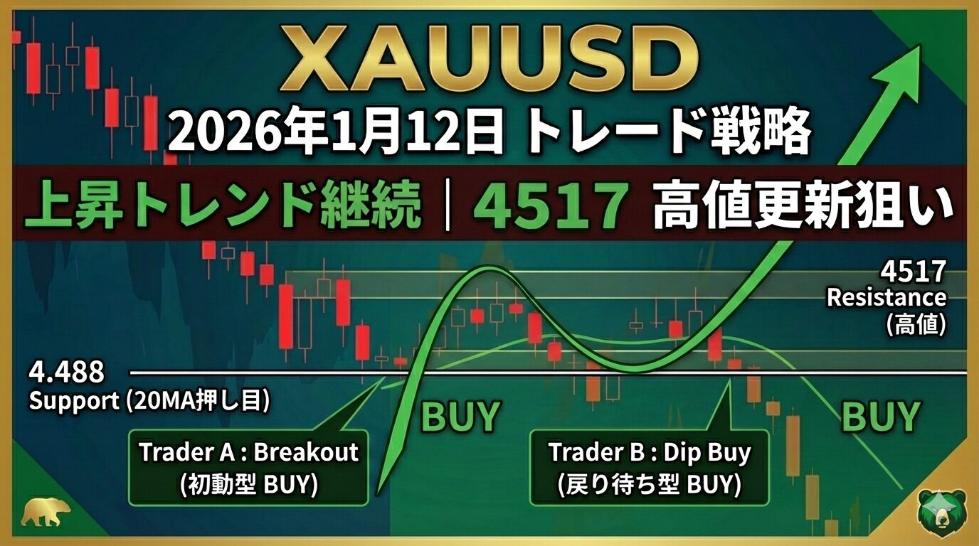 2026年1月12日(月)のXAUUSD(ゴールド/米ドル)について、裁量トレード×クオンツ分析の視点から戦略を立案しました。