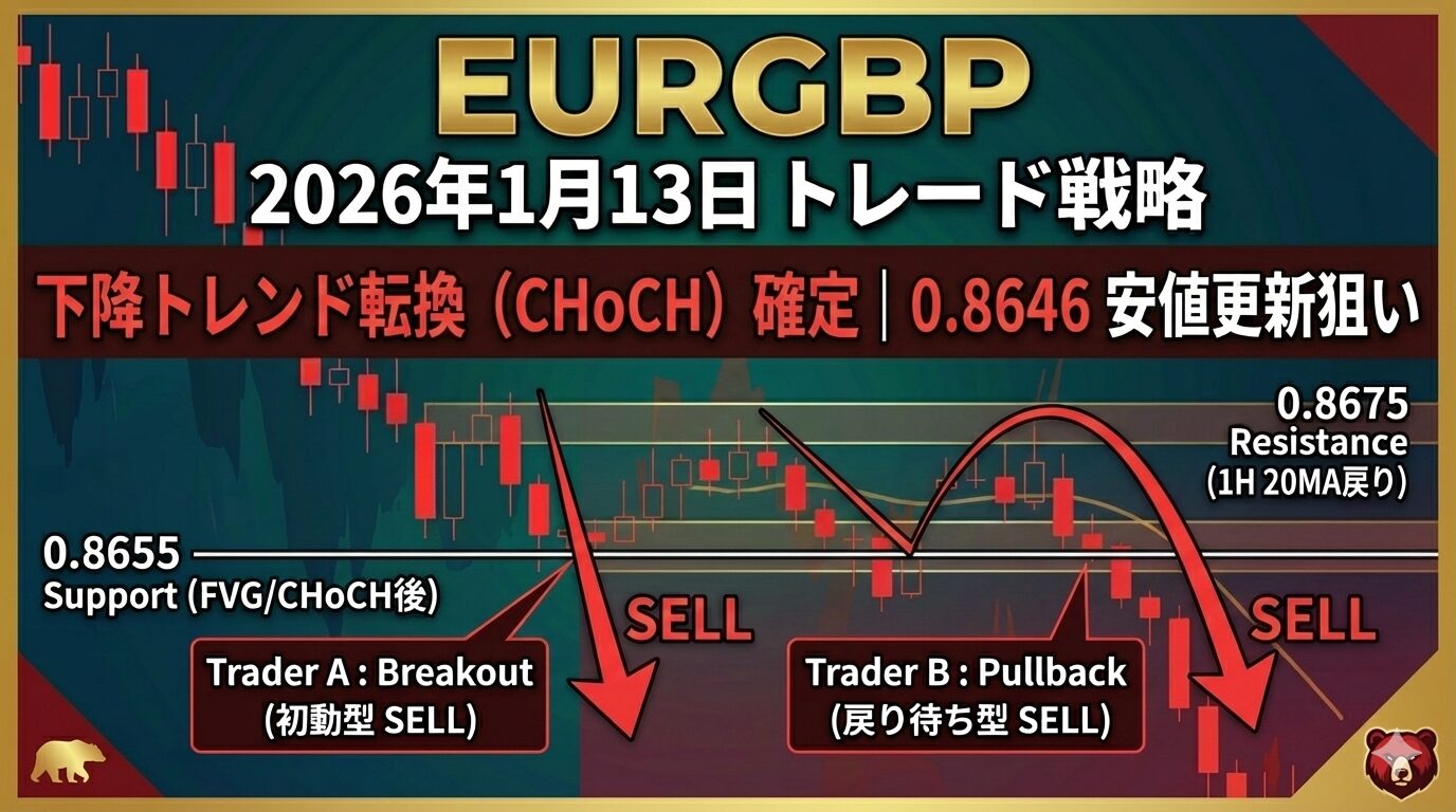 【EURGBP】2026年1月13日のトレード戦略 | 下降トレンド転換(CHoCH)確定で0.8646安値更新を狙う
