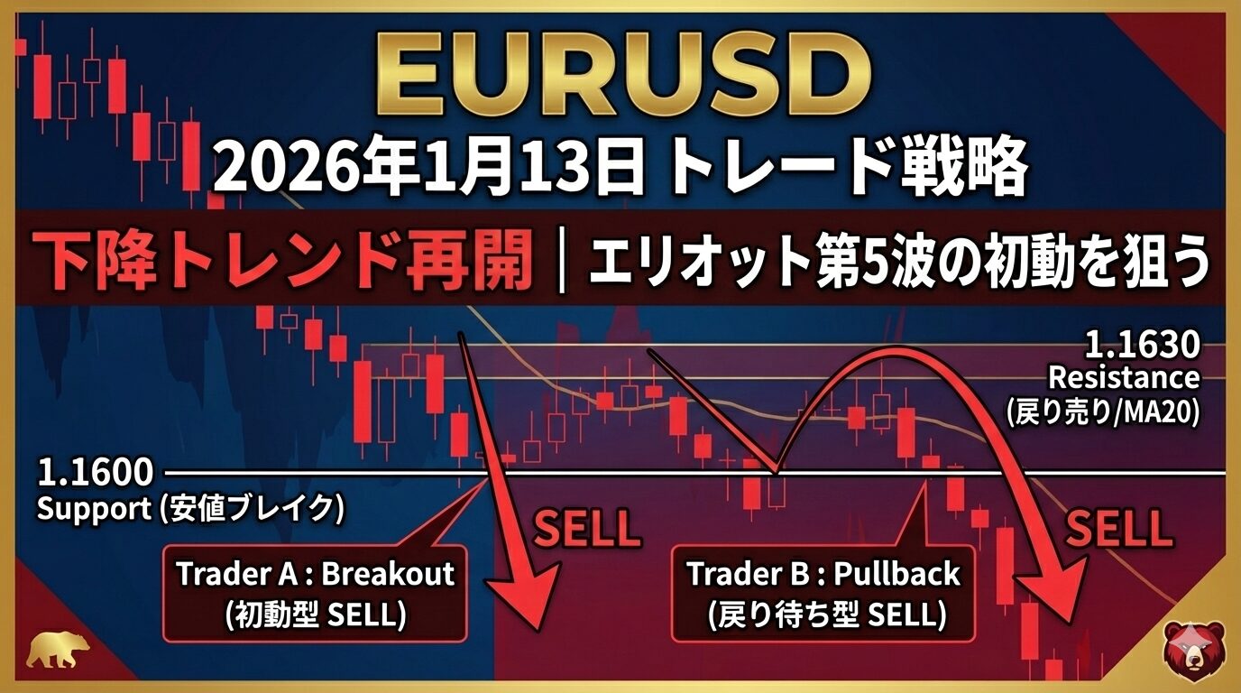 【EURUSD】2026年1月13日のトレード戦略 | 下降トレンド再開でエリオット第5波の初動を狙う