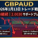 2026年1月13日のEURUSD分析。4時間足下降トレンド継続中、エリオット第5波入りを想定。Trader Aのブレイクアウト、Trader Bの戻り売り戦略で最大RR比2.2を狙う実践的解説。