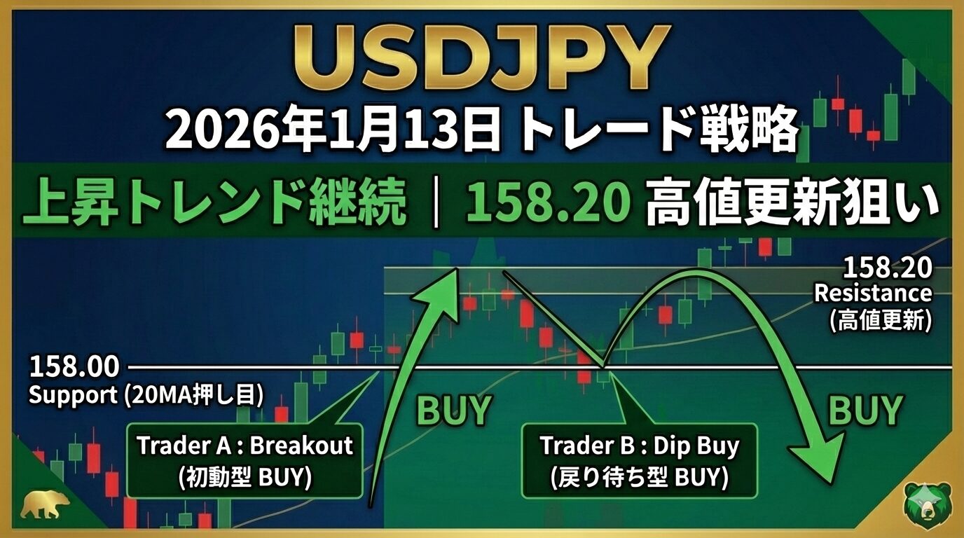 2026年1月13日(火)のUSDJPY(米ドル/日本円)について、裁量トレード×クオンツ分析の視点から戦略を立案しました。