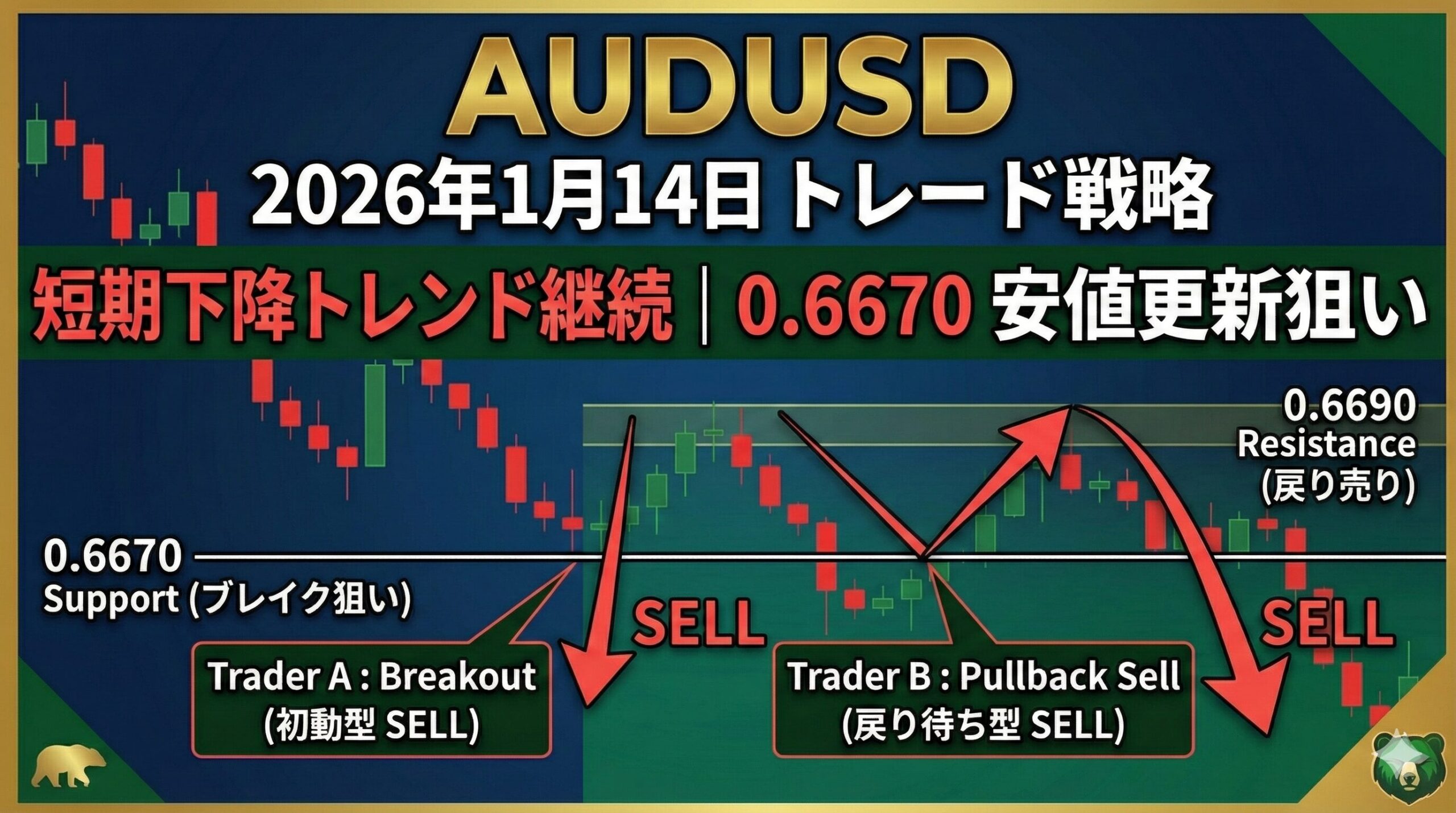 - Trader A(初動型): 0.6670サポート割れを狙った真空地帯へのブレイクアウト戦略