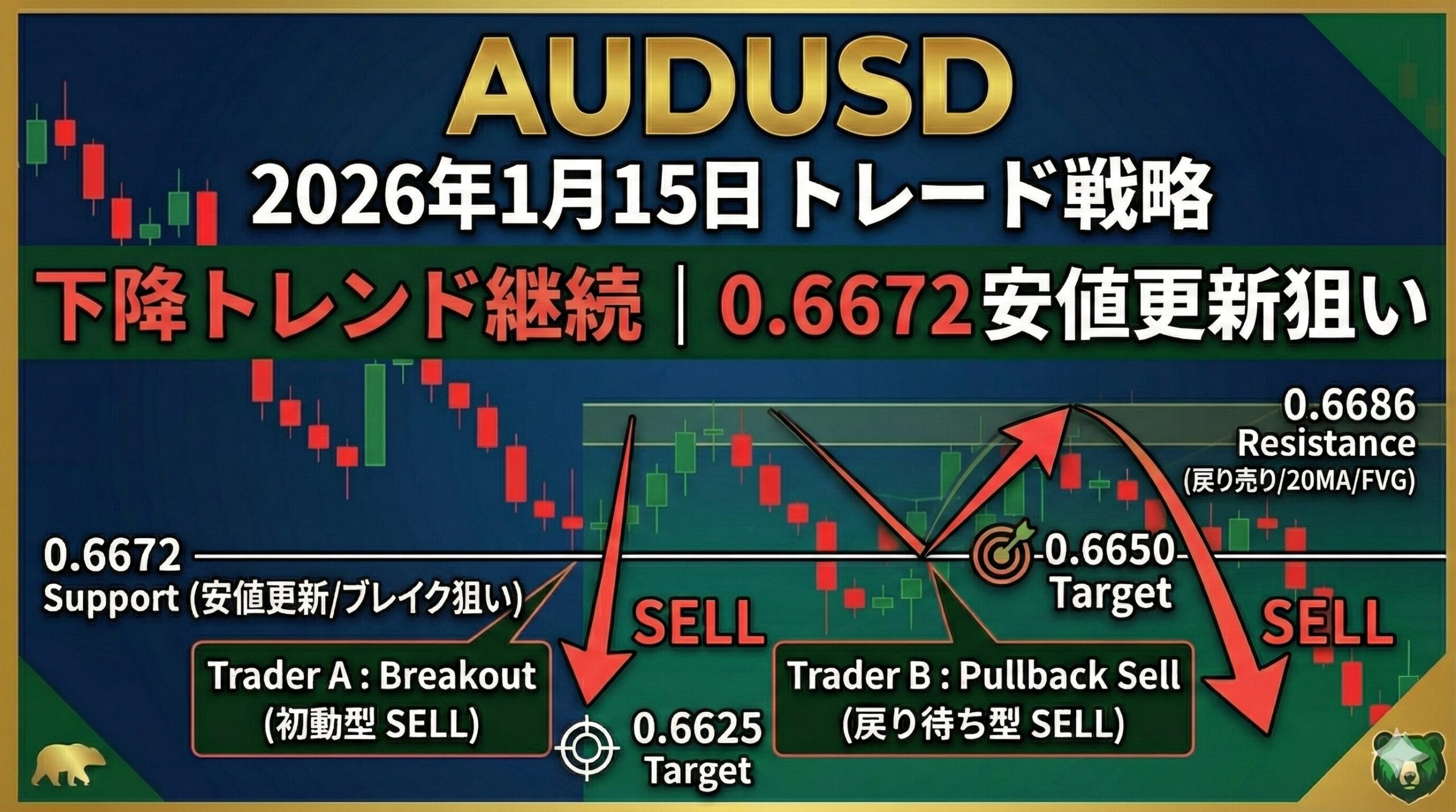 - Trader A(初動型): 重要サポート0.6672ブレイク後の加速を狙うショート戦略