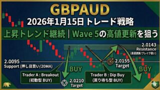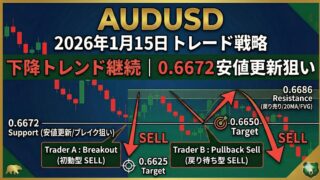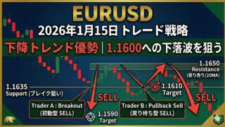 第1章: 概要(導入部)1.2. メタディスクリプション2026年1月15日のGBPCHF分析。下降トレンド継続中、1時間足20MA戻り売りに注目。Trader A/B戦略でRR比最大3.2を実現。テクニカル分析に基づく実践的戦略。1.3....